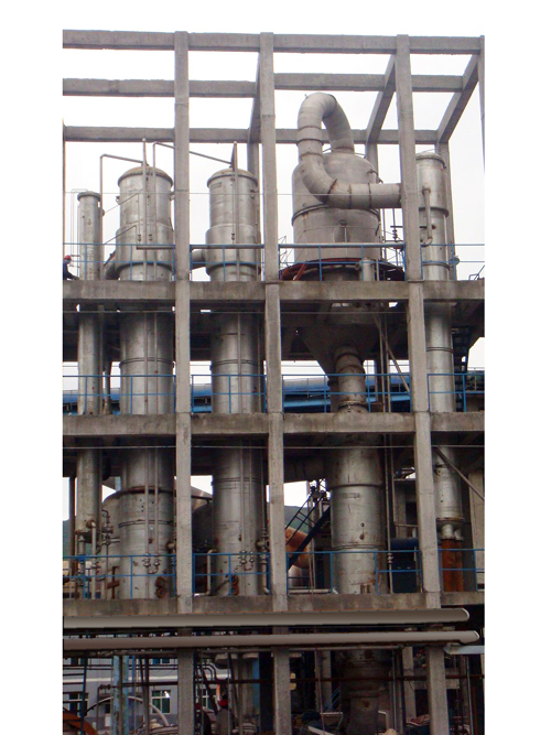 設備連接是由一效外循環濃縮鍋的二次蒸汽口通過氣動閥分別連接二效加熱室和冷凝冷卻器,根據生產不同的規模及要求采用不同的生產方式(雙效或單效)。