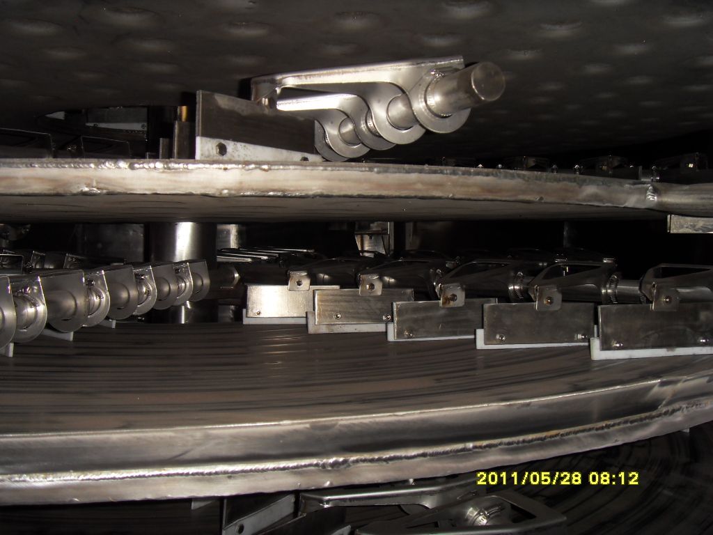 濕物料自加料器連續地加到干燥器上部干燥盤上,帶有耙葉的耙臂作回轉運動使耙葉連續地翻 抄物料。物料沿指數螺旋線渡過干燥盤表面,在小干燥盤上的物料被移送到外緣,并在外緣落到下方的大干燥盤外緣,在大干燥塔上物料向里移動并從中間落料口落入下一層小干燥盤中。大小干燥盤上下交替排列,物料得以連續地流過整個干燥器。中空的干燥盤內通入加熱介質,加熱介質形式有飽和蒸汽、熱水和導熱油,加熱介質由干燥盤的一端進入,從另一端導出。已干物料從一層干燥盤落到殼體的底層,被耙葉移送到出料口排出。濕份從物料中逸出。由設在頂蓋上的排濕口排出,真空型盤式干燥器的濕氣由設在頂蓋上的真空泵抽出。從底層排出的干物料可直接包裝。通過配加翅片加熱器、溶劑回收冷凝器、袋式除塵器、干料返混木結構、引風機等輔機,可提高其干燥的生產能力,干燥膏糊狀和熱敏性物料,可方便地回收溶劑,并能進行熱解和反應操作。